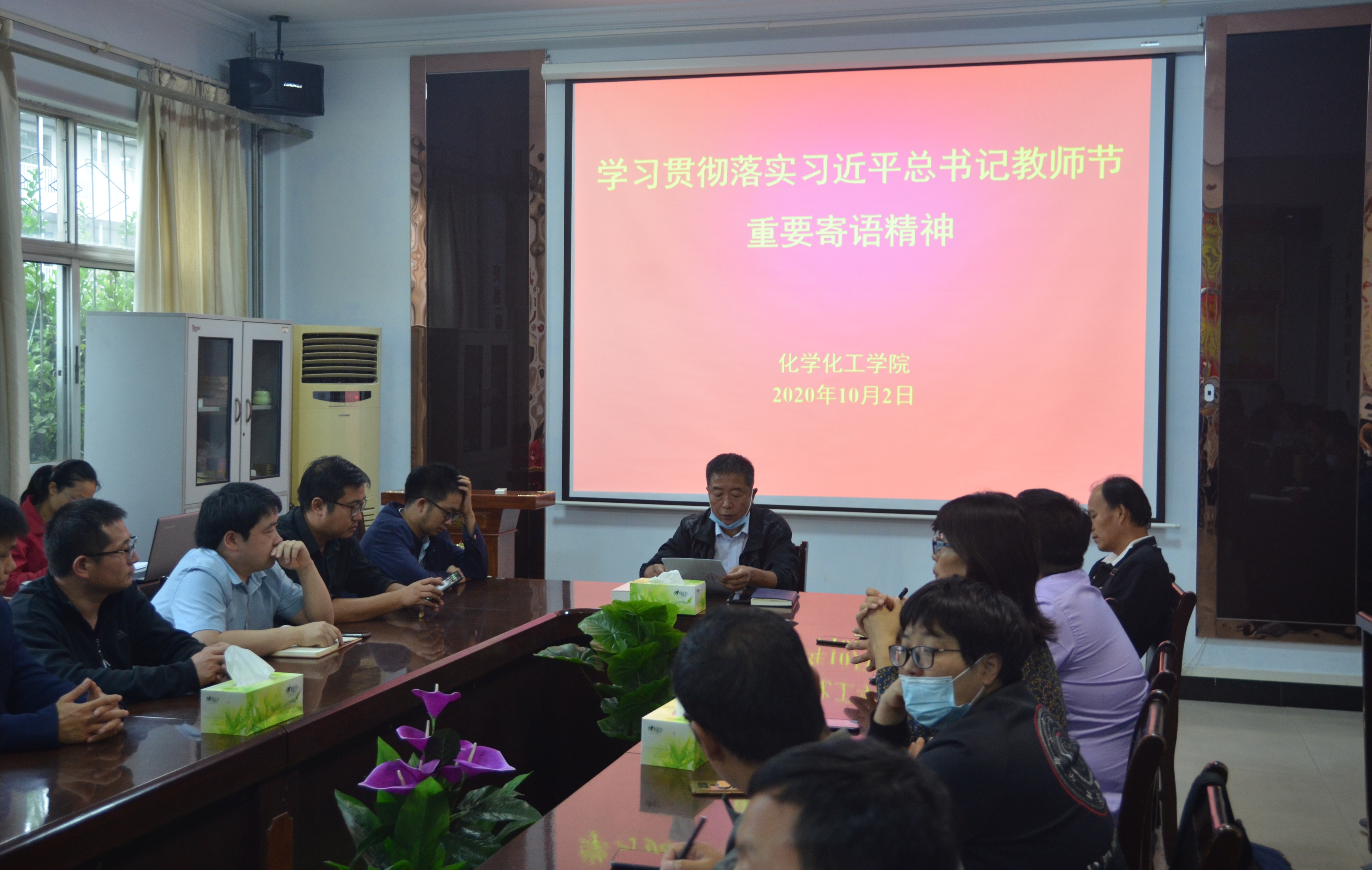 “教育是民族振兴、社会进步的基石,教师是基石的奠基者”。为进一步加强教师队伍建设,2020年10月2日,化学化工学院于睢阳校区7号楼院会议室组织学习贯彻落实习近平总书记教师节重要寄语精神,会议由党总支书记韩忠民主持,全体教职工参加。