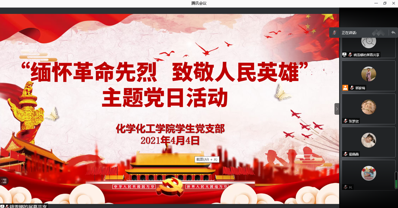 为缅怀英烈、铭记历史,牢记初心,勇担使命,4月4日清明节,化学化工学院学生党支部在线开展了“缅怀革命先烈,致敬人民英雄”主题党日活动,向所有为民族独立、人民幸福而牺牲的先烈英雄致敬。全体学生党员和党支部书记参加活动。