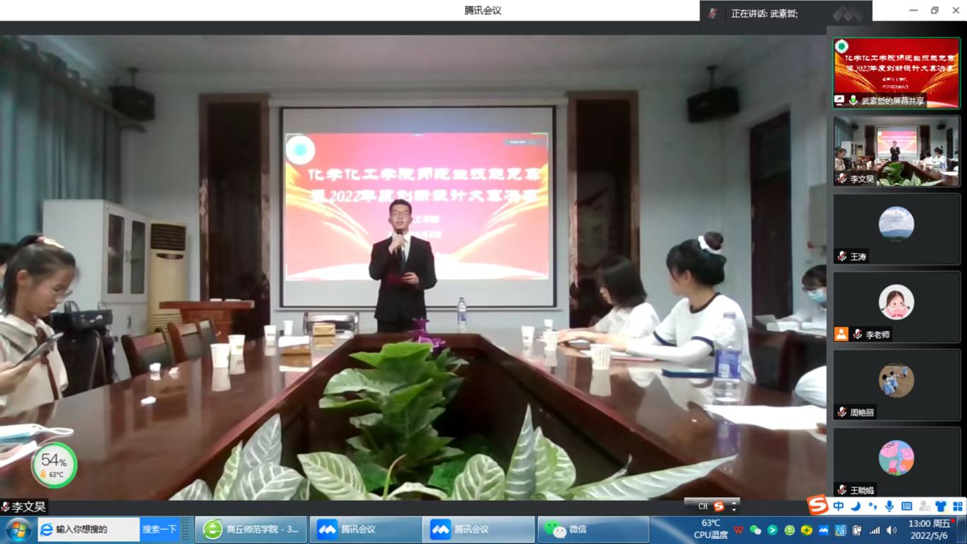 为提升化学师范生教育教学能力,提高PPT创新设计能力,5月6日,化学化工学院于睢阳校区7#104会议室举行了化学专业师范生技能竞赛暨2022年度PPT创新设计大赛决赛。院党委副书记张颜梅、副院长周艳丽、副院长王涛及专业评委老师出席本次活动。