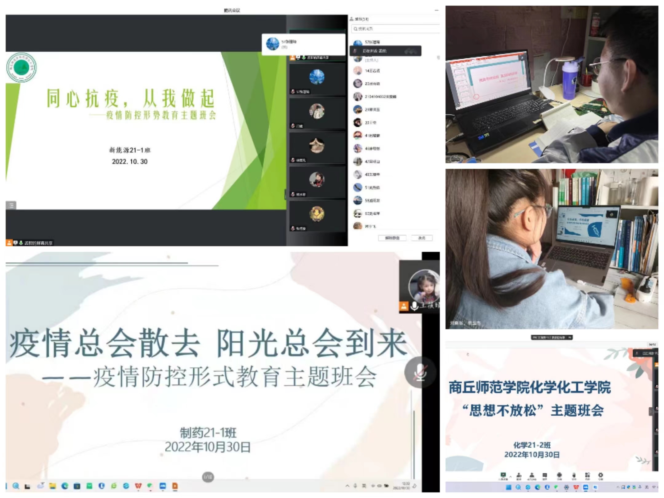 10月30日,2020级组织开展“同心抗疫,共克时艰”主题班会,辅导员李龙梅强调要认清疫情形势的严峻性,增强危机意识,在校园内正确佩戴口罩,按时核酸检测及时上报检测情况。张颜梅提出坚决不信谣、不传谣、不造谣,理解我校疫情防控规定,提高自身思想建设,提升自我品质素质,学会心理调节适当放松自我。