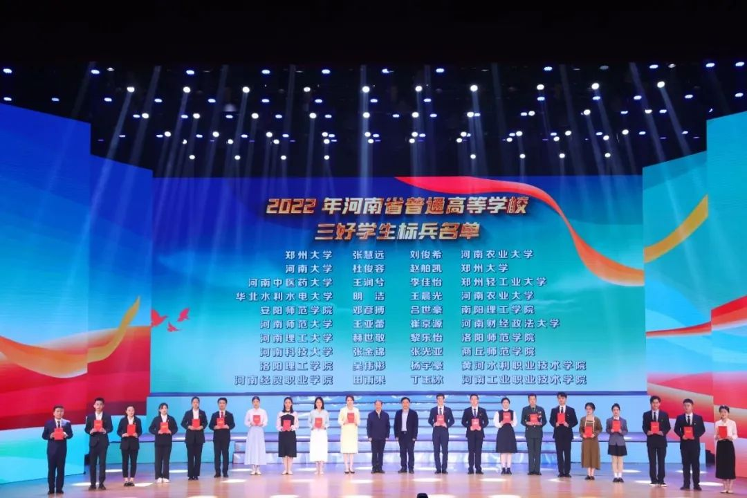 4月23日下午,2022年河南省普通高等学校三好学生标兵颁奖典礼在河南农业大学龙子湖校区举行。省委教育工委专职委员吕冰,河南农业大学党委副书记、校长介晓磊,共青团河南省委副书记王继威,河南农业大学党委副书记游舸,省教育厅思想政治工作处处长陈凯,省教育厅学生工作处处长李班,共青团河南省委学校部部长刘淑丽出席颁奖典礼,永利23411集团学生张光亚作为三好学生标兵上台领奖。