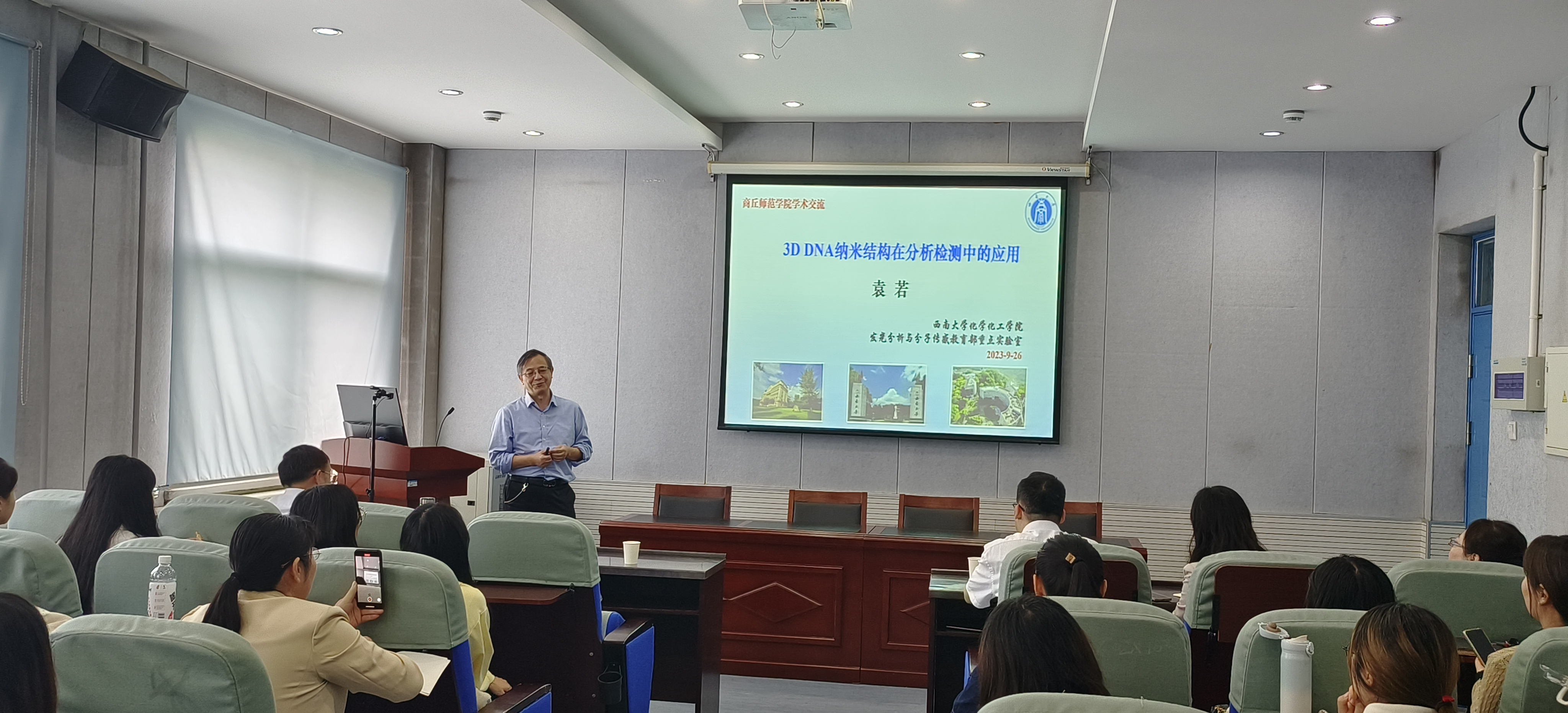 9月26日,应化学化工学院邀请,西南大学袁若教授在我校睢阳校区化学实验楼311报告厅作了题为《3D DNA纳米结构在分析检测中的应用》的学术报告。报告会由化学化工学院院长张银堂主持,河南省生物分子识别与传感重点实验室主任徐茂田教授、学院部分教师、研究生及本科生参加。