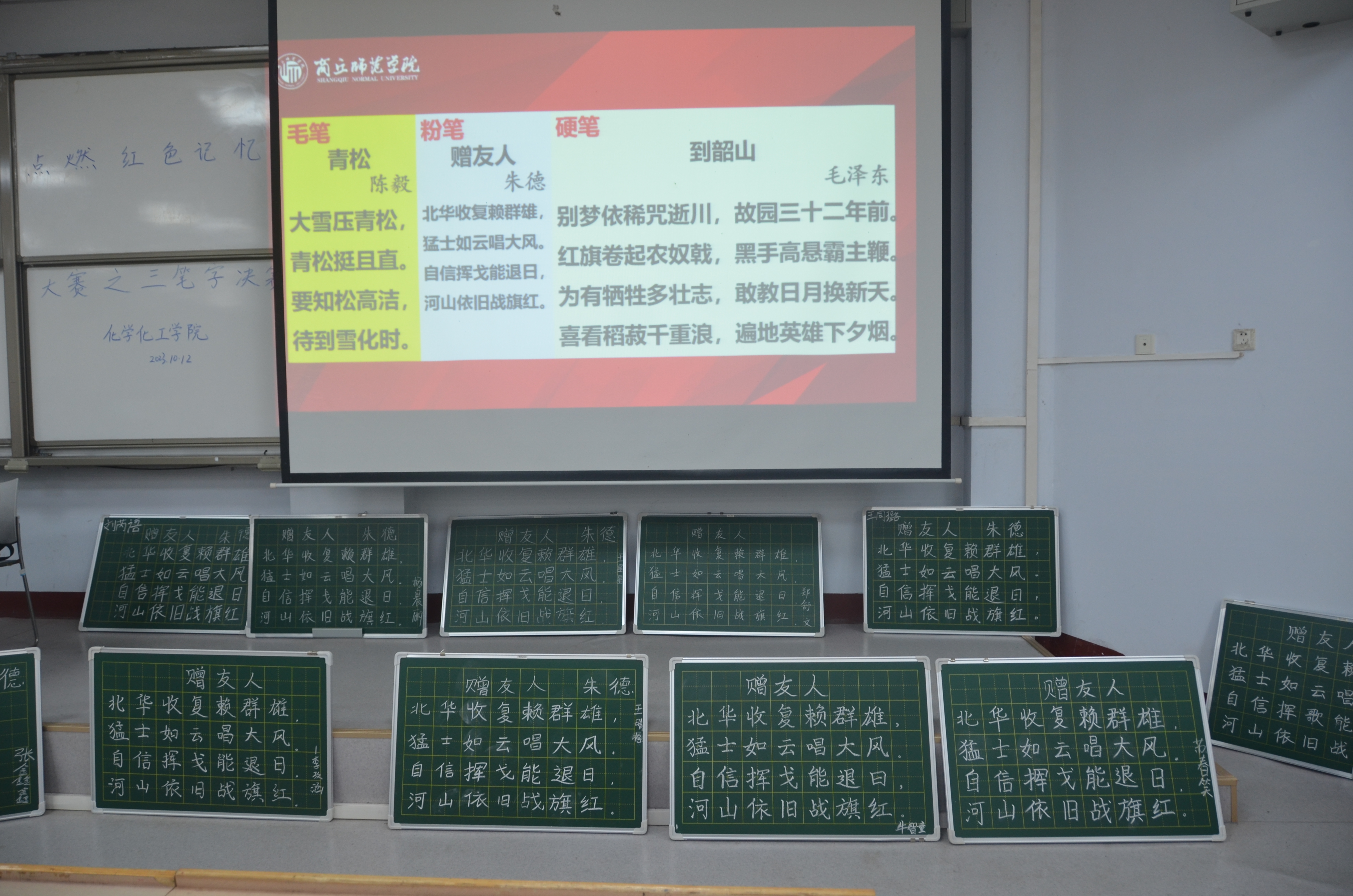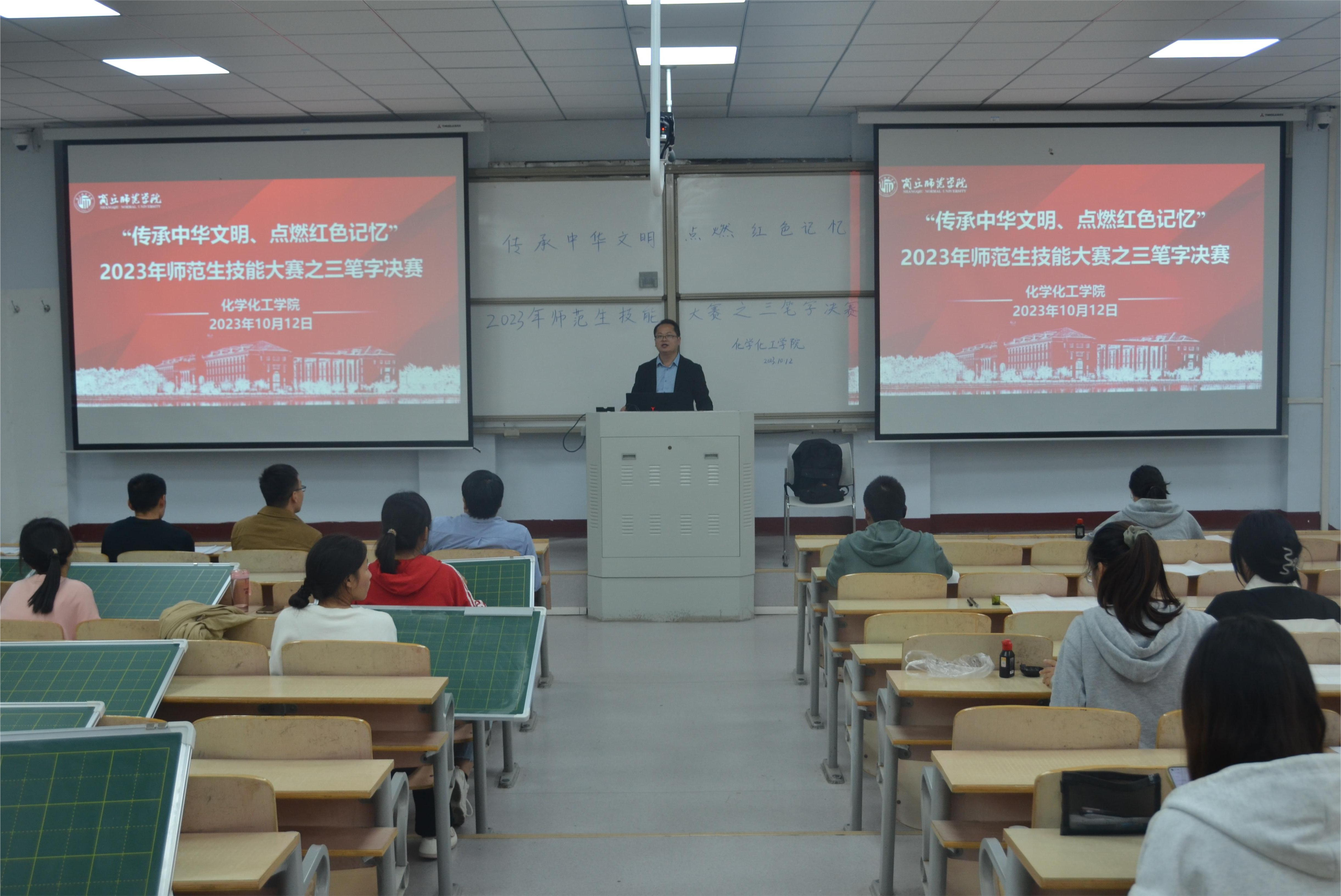 为进一步提高学生的书写能力,为学生提供一个展现自我的平台,营造互相交流、共同学习、共同进步的氛围,10月12日,化学化工学院于1号教学楼106教室举办了“传承中华文明,点燃红色记忆”师范生技能“三笔字”大赛。化学化工学院副院长王涛,化学系主任董辉,专业教师刘传志、张明亮出席本次大赛。