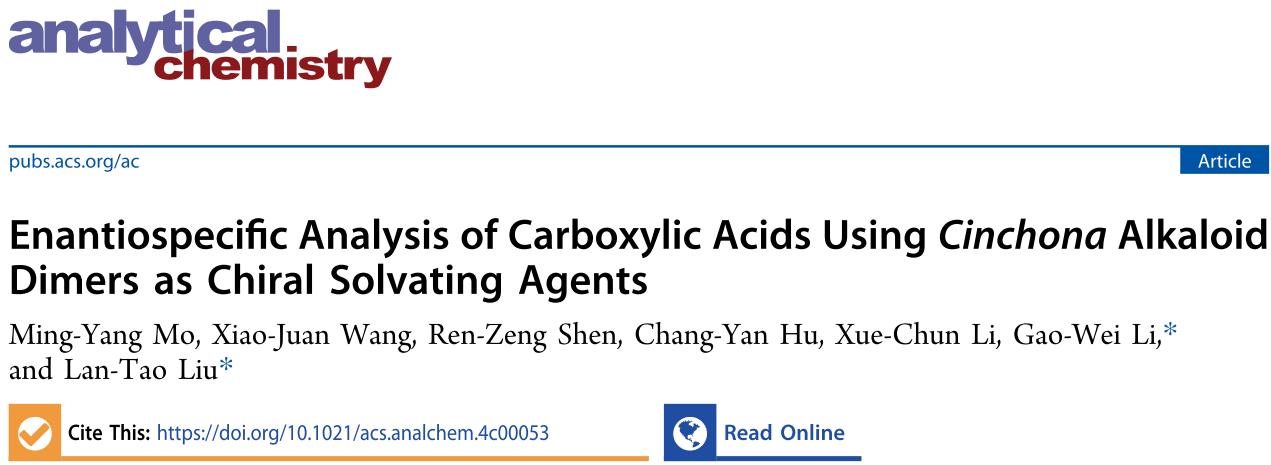 近日,永利23411集团与郑州大学联合培养的2021级有机化学专业硕士研究生莫明洋作为第一作者在国际知名期刊Analytical Chemistry(中科院一区,IF=7.4,TOP期刊)上发表了题为“Enantiospecific Analysis of Carboxylic Acids Using Cinchona Alkaloid Dimers as Chiral Solvating Agents”的研究论文(论文链接:https://doi.org/10.1021/acs.analchem.4c00053)。该研究报道了一种基于金鸡纳碱二聚体为核磁共振手性位移试剂通过核磁共振波谱技术对扁桃酸及其衍生物进行高效快速与准确的手性识别与分析
