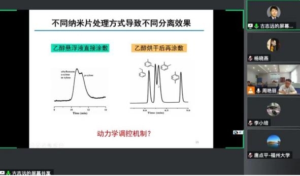 古志远教授作了题为“亚纳米孔色谱分离介质研究”的学术报告。报告介绍了将二维MOFs 纳米片应用于毛细管气相色谱固定相,通过改变纳米片层间堆叠模式来调控层间弱相互作用,从而提高纳米片分离取代苯异构体的能力。他们提出了一种客体分子诱导策略和简单高效的加热处理过程,可以调控2-D MOFs纳米片层间扭转或规整堆积,高度有序的亚纳米级孔径为高效分离取代苯结构异构体提供了可能。