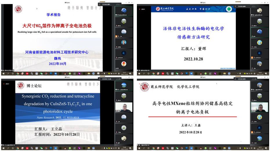 为加强各学科之间的交叉融合,开拓新的研究领域,激发科研灵感和创意,化学化工学院举办系列学术论坛。10月28日,由河南省新能源电池材料工程技术研究中心承办的第二期学术论坛采用线上方式进行,邀请化学化工学院魏伟、董辉、王立晶和王鑫四位博士作学术报告。报告会由化学化工学院副院长王涛、河南省新能源电池材料工程技术研究中心主任魏伟主持,化学化工学院全体教师、硕士研究生和部分本科生参加报告会。