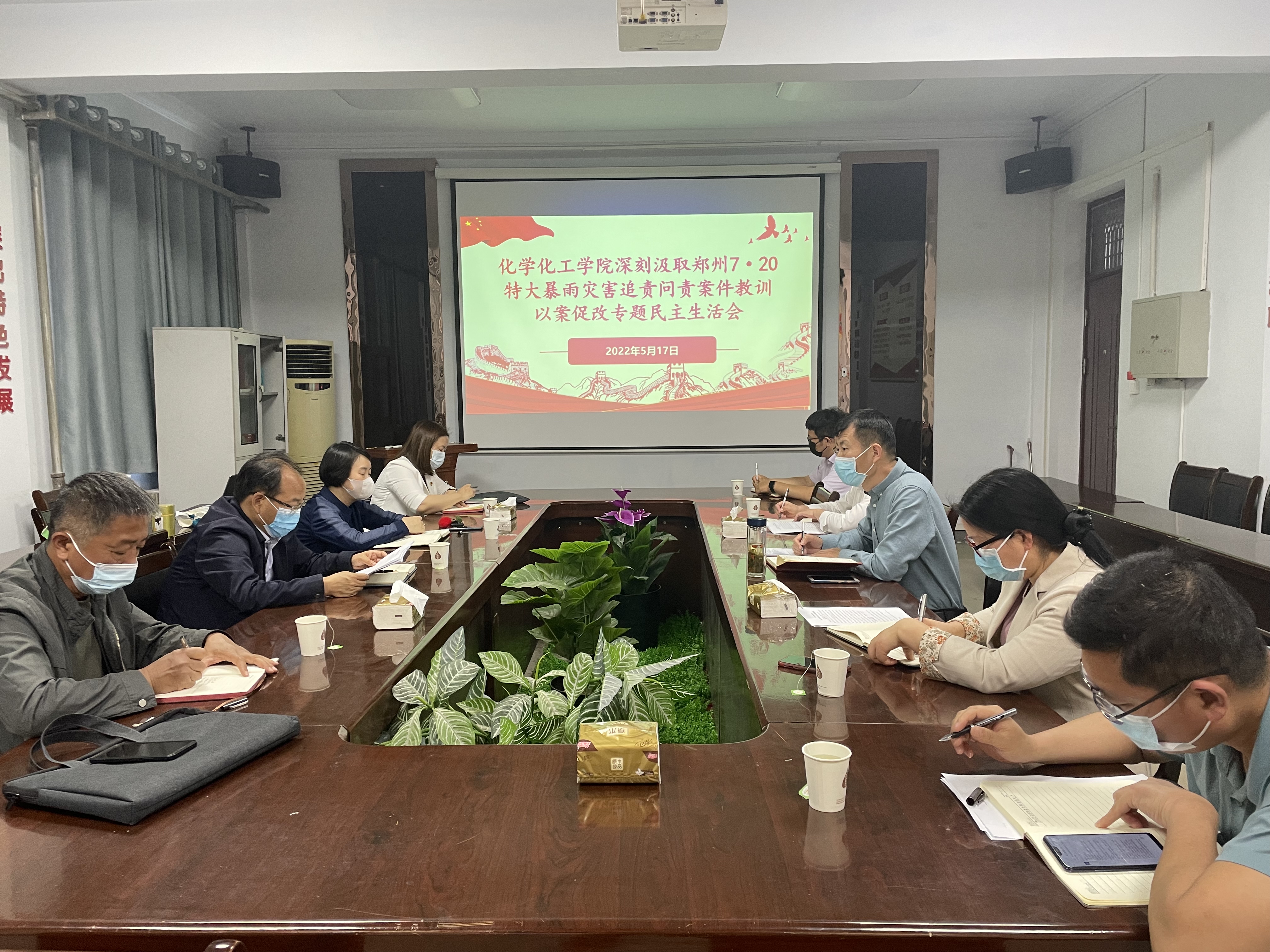 按照《中共永利23411集团委员会<关于深刻汲取“7·20”特大暴雨灾害追责问责案件教训开展以案促改专题民主生活会的通知>》要求,5月17日下午,化学化工学院召开郑州“7·20”特大暴雨灾害以案促改专题民主生活会。学校专题民主生活会第八指导组组长、副校长郭文佳和指导组成员统战部部长黄蕾、纪委第一纪检监察室主任任鸿敏以及学校纪检监察员监督指导组组长韩忠民莅临指导。院党政领导班子成员参会,河南省生物分子识别与传感重点实验室副主任朱旭、药物绿色合成河南省工程实验室主任李峰列席会议。会议由院党委书记李海涛主持。