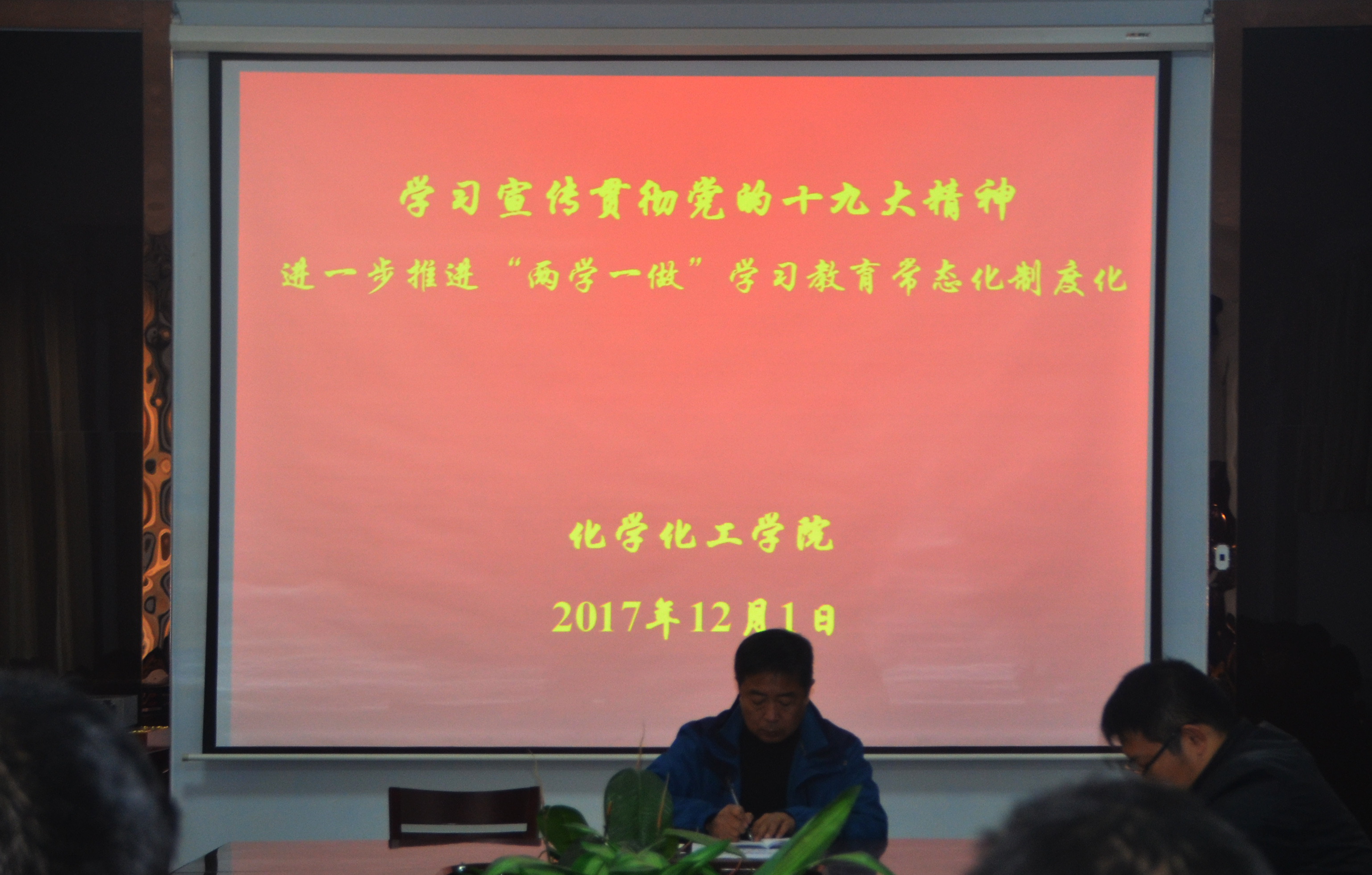 12月1日下午,化学化工学院于我校文化路校区7号楼院会议室召开了“学习贯彻党的十九大精神——进一步推进‘两学一做’学习教育常态化制度化”的学习交流会议。化学化工学院全体教师参加了会议。会议由院党总支书记韩忠民主持。