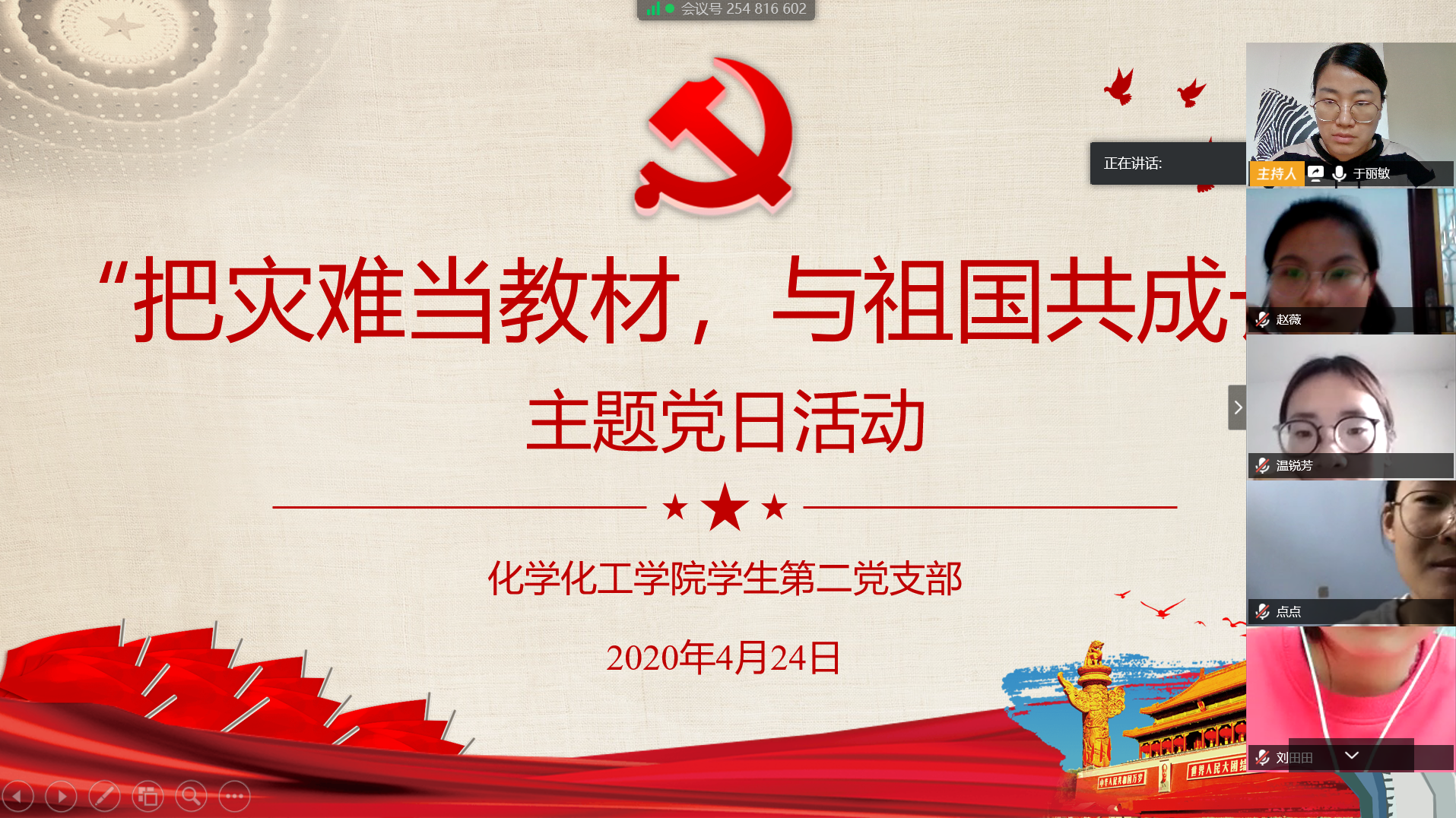 2020年4月24日下午6点,化学化工学院学生第二党支部采用腾讯会议开展了题为“把灾难当教材、与祖国共成长”的主题党日活动,全体学生第二党支部的党员参加了本次会议。会议开始,党支部书记于丽敏首先宣读了商师党发2020-10号文件—中国永利23411集团委员会关于开展“把灾难当教材与祖国共成长”主题教育活动的通知,随后各位党员同学积极发言,汇报了疫情期间在家内学习的党的知识及关注的时事动态。