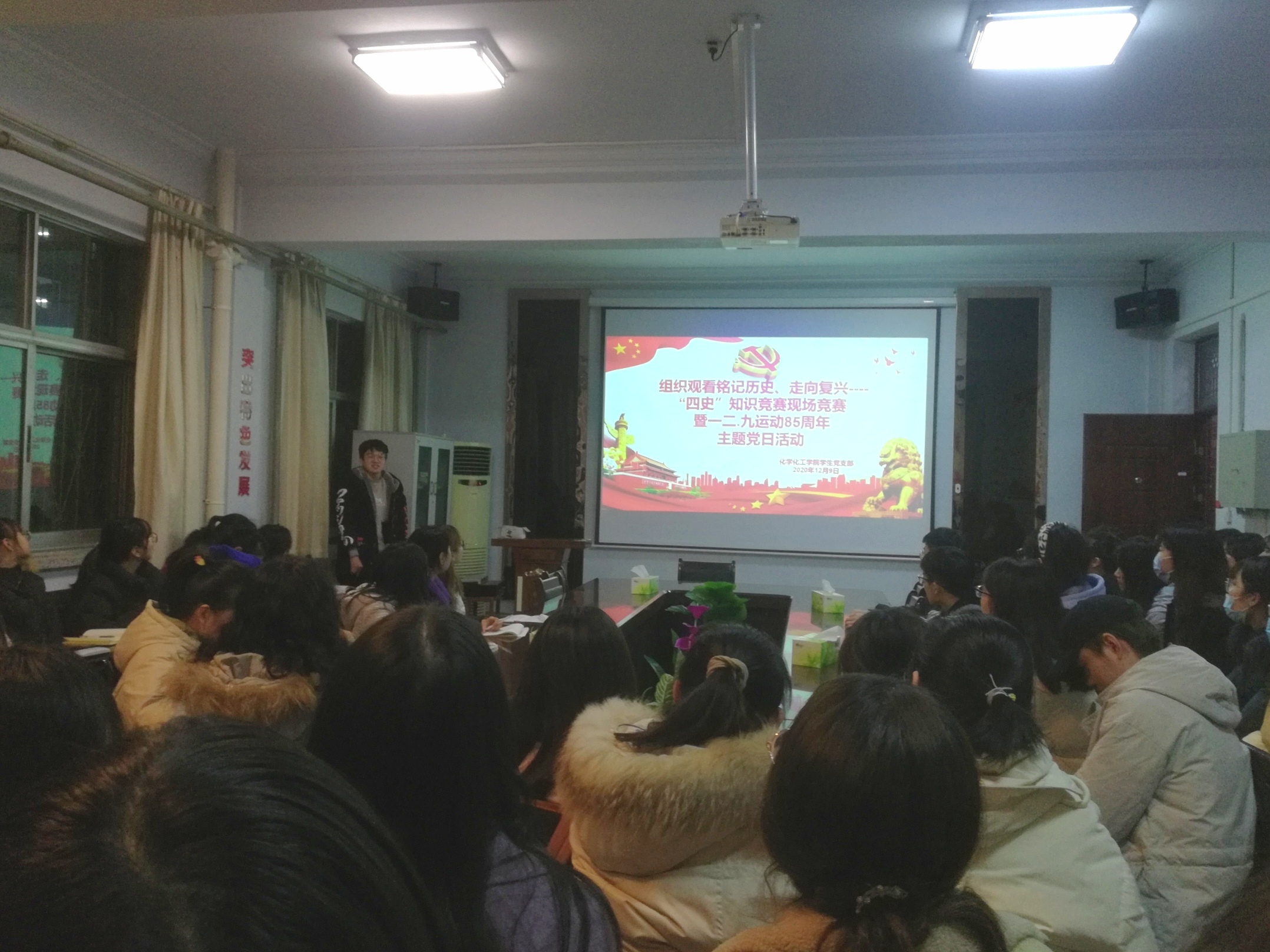 为深入学习贯彻习近平新时代中国特色社会主义思想,特别是习近平总书记关于“四史”的重要论述,进一步提升党员干部理论素养和党性修养,持续营造学的氛围、严的氛围、干的氛围,2020年12月9日,化学化工学院学生党支部于睢阳校区7号楼会议室组织观看了铭记历史、走向复兴——“四史”知识竞赛现场竞赛暨一二•九运动85周年主题党日活动。