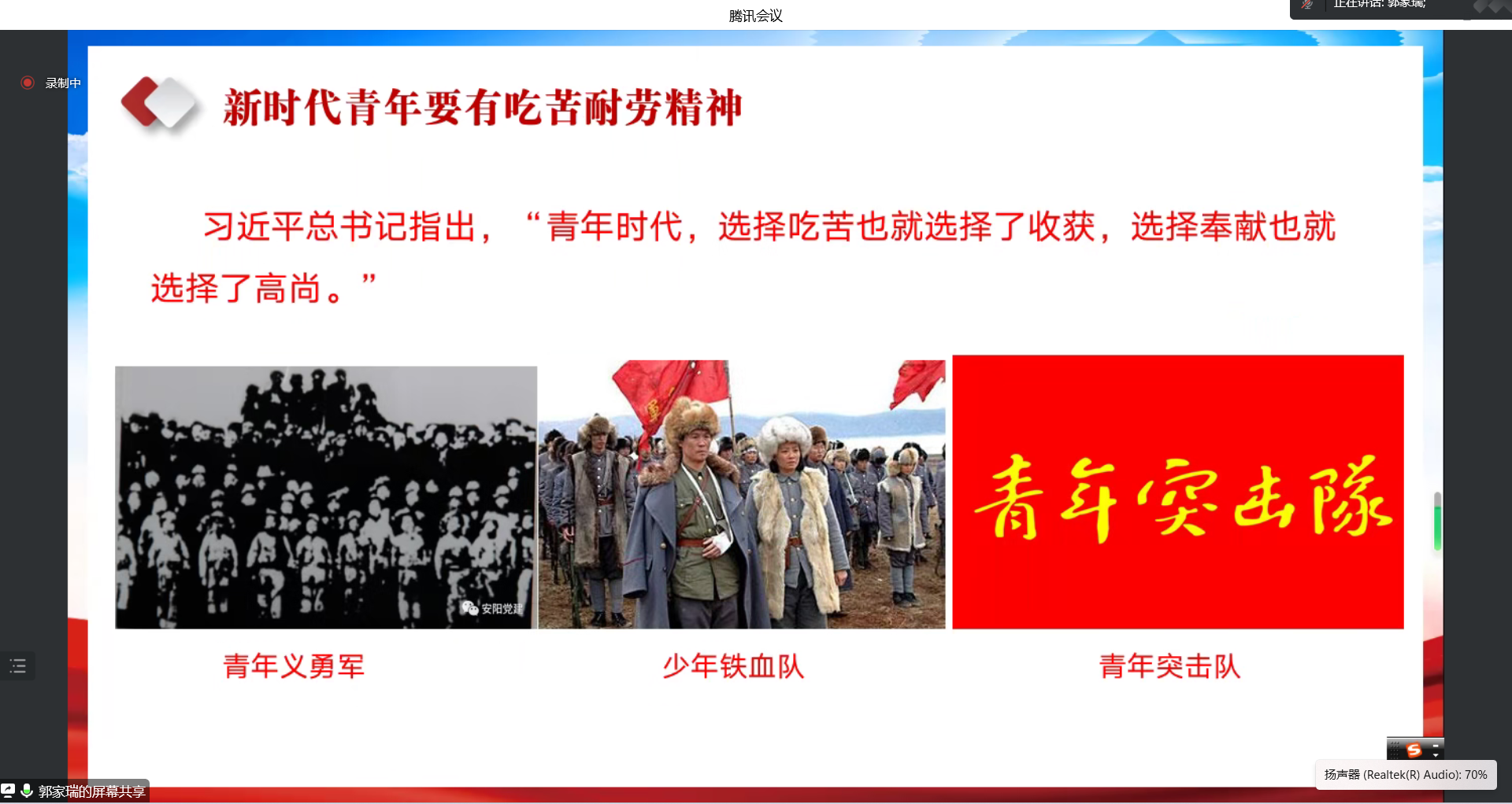 郭家瑞以“听二十大奋进之声,做新时代有为青年--深刻理解过去五年的工作和新时代十年的伟大变革”为题,从“大会主题阐释、深刻理解过去五年的工作和新时代十年的伟大变革、做新时代奋进有为青年”三个方面解读了大会主题的深刻内涵,通过丰富的案例展示了新时代十年党和国家事业取得的伟大变革和伟大成就,引领大家深刻理解新时代十年的伟大变革根本在于有以习近平同志为核心的党中央的运筹帷幄,在于有习近平新时代中国特色社会主义思想的举旗定向,“两个确立”从根本上推动着党和国家事业行稳致远,在百年变局中不断开拓新局面。郭家瑞号召大家,要牢记习近平总书记和人民的嘱托,立志做有理想、敢担当、能吃苦、肯奋斗的新时代青年。