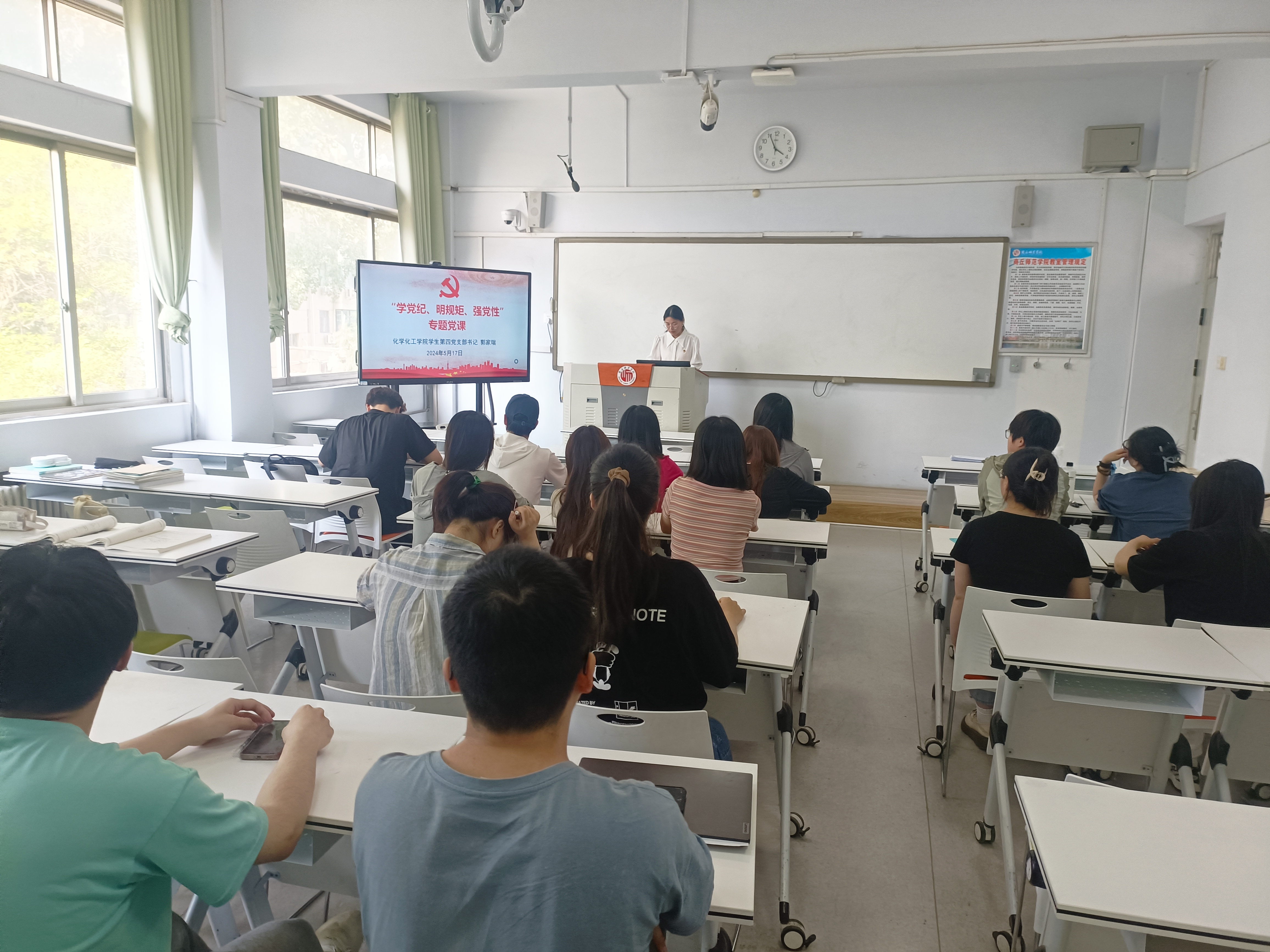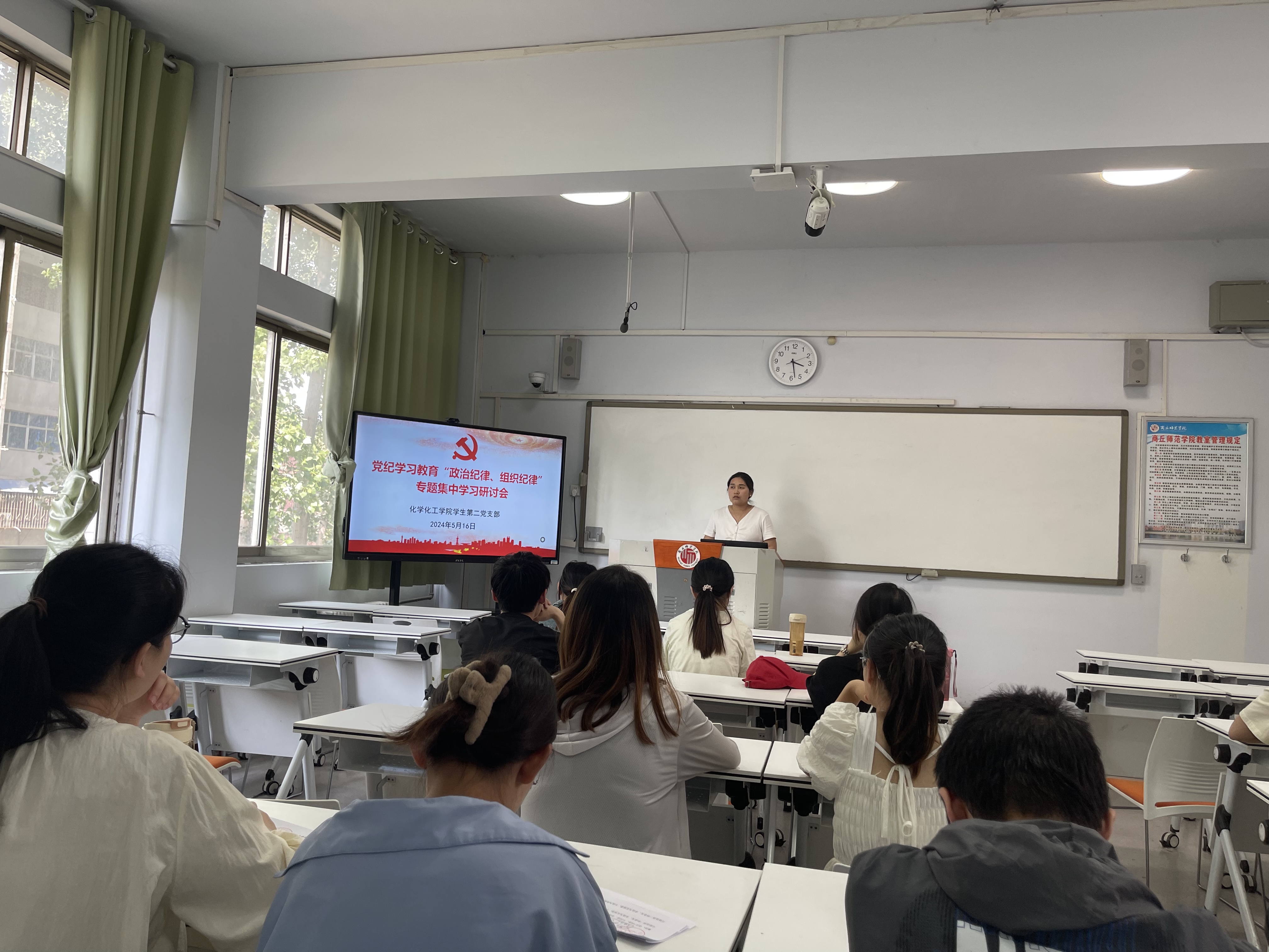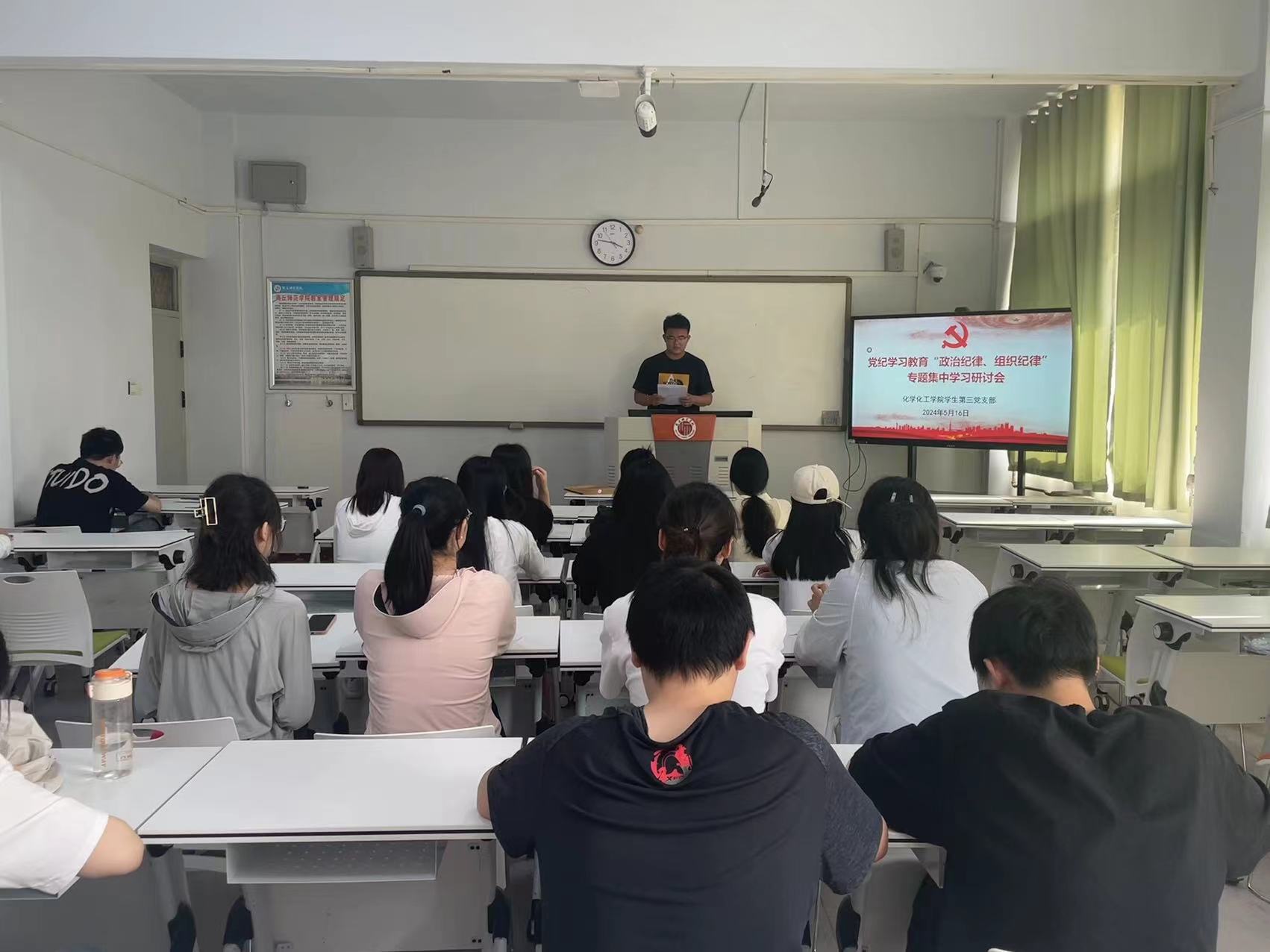 5月16日、5月24日学生第一、第二、第三党支部分别开展党纪学习教育集中学习研讨会和党员警示教育案例分享会,5月29日开展“学《条例》,守党纪”纪律党课。5月17日、5月29日学生第四党支部分别开展“学党纪、明规矩、强党性”专题党课和党纪学习教育专题研讨会,围绕政治纪律、组织纪律进行研讨。