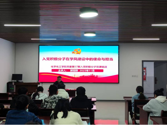 11月4日,化学化工学院分党校第57期入党积极分子培训第三讲在工科实训大楼B-309会议室进行,学生第三党支部书记郭冠群以“入党积极分子在学风建设中的使命与担当”为题,为学员们明确了标杆示范、氛围带动、活动组织、师生桥梁、关怀促优的角色定位。