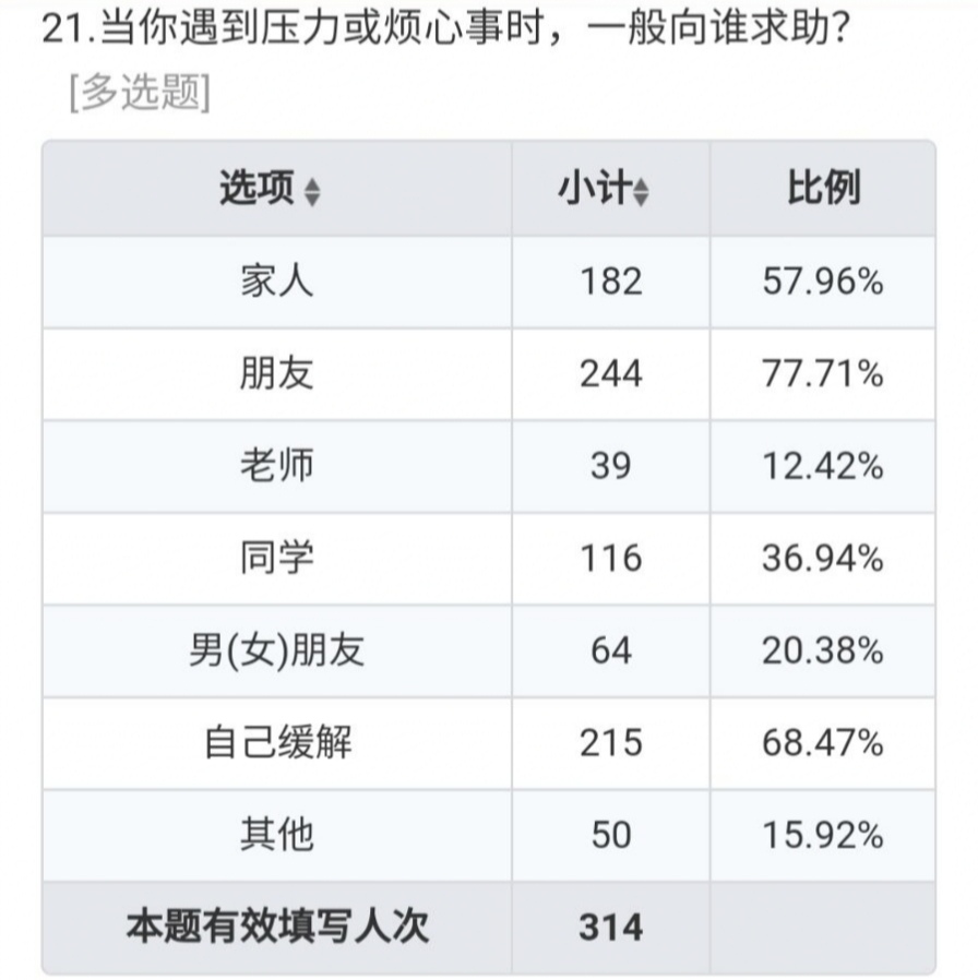 本次问卷调查采取随机抽样调查的方式,从化学化工学院18、19、20级学生中抽取一部分为代表反映整体调查情况,面向现代大学生学业和生活方面的问题进行调查。调查显示,部分同学对自己以后的生活或学业会产生焦虑,当遇到压力或烦心事时向老师求助较少而更多的是选择自己缓解,且常会有自我管理能力不强、课程学习有点难、人生发展与职业选择上有困难等诸多烦扰。根据调查分析得知,将近半数大学生希望得到一对一心理咨询、网络心理咨询等心理健康服务方式。