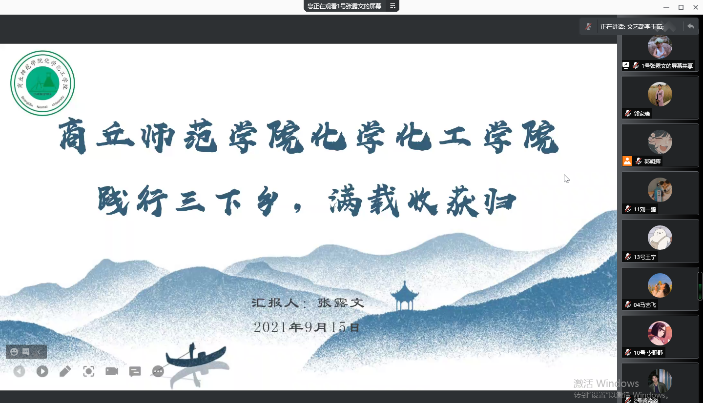 9月15日,化学化工学院在线开展2021年线上暑期“三下乡”归来话收获活动。院党委副书记张颜梅、团总支副书记郭家瑞、学工办副主任史展、辅导员李宁娅参加了此次活动。