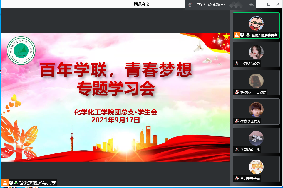 为增强化学化工学院团总支·学生会成员工作能力和服务意识,保证新学期各项工作扎实推进,9月17日下午,团总支•学生会于腾讯会议召开线上全体例会,会议由赵俊杰主持。