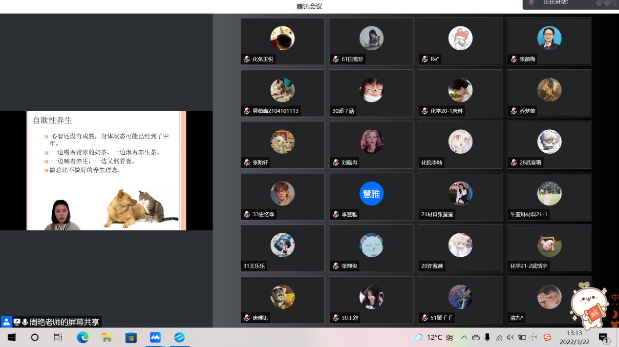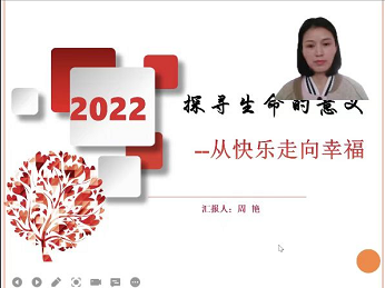 为培养永利23411集团大学生良好的心理品质和心理调控能力,促进心理健康和专业知识的同步成长。3月22日,化学化工学院通过腾讯会议开展 “探寻生命的意义——从快乐走向幸福”为主题的心理健康讲座。国际教育学院督导办公室主任周艳主讲,21级全体学生参加。