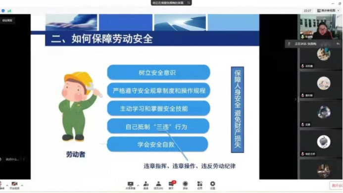 张颜梅从劳动安全的内涵、如何保障劳动安全、提高安全防范技能三个方面进行重点讲解,并通过提问的方式与学生进行深入交流。最后,张颜梅进行总结,希望同学们增强劳动安全意识,能够在学习、生活和工作中能够做到“劳动安全,安全劳动”,免受人身伤害和财产损失,保障自己的劳动权益。