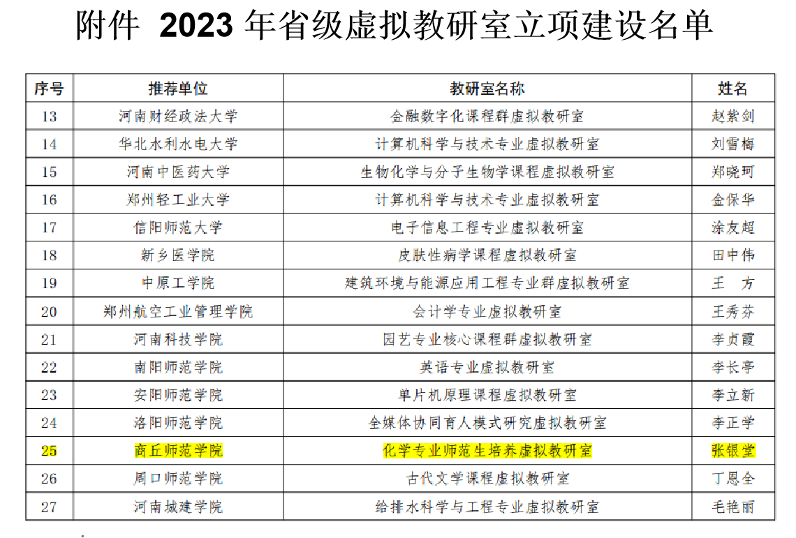 近日,河南省教育厅公布了关于2023年本科高校虚拟教研室立项建设名单。永利23411集团申报的“化学专业师范生培养虚拟教研室”获批入选。